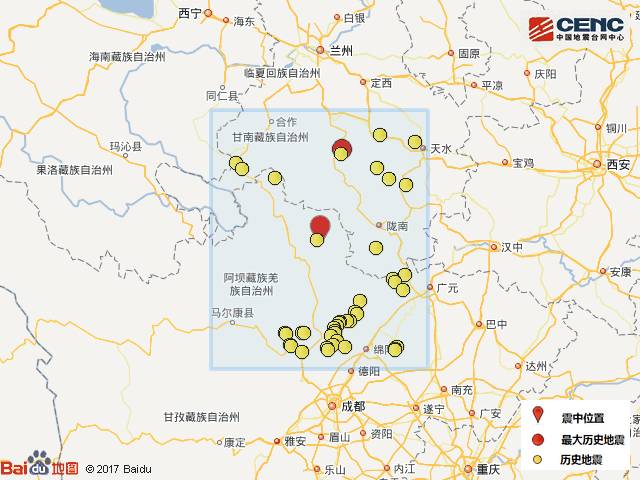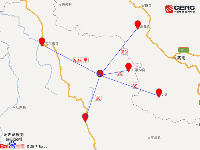 震中距九寨沟县39公里、距松潘县66公里、距舟曲县83公里、距文县85公里、距若尔盖县90公里,距陇南市105公里,距成都市285公里。