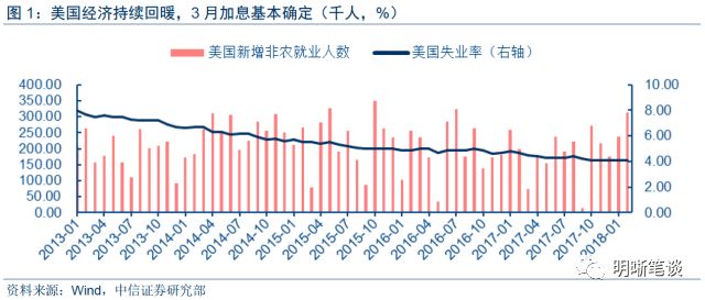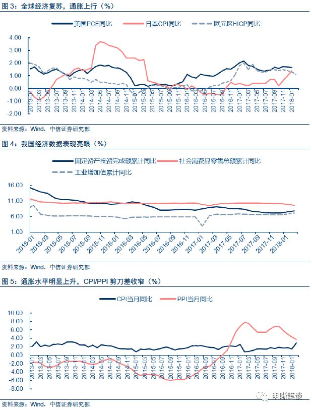 2018年以来,包括中国在内的全球主要经济体的复苏趋势更加明显。从最新数据来看,美国非农就业超预期,失业率保持4.1%的低位,工业产出增长强劲,制造业复苏明显;欧元区GDP和CPI、PPI等数据与预期持平并保持稳定。国内经济表现良好,2018年前两个月的工业生产和投资表现亮眼,消费零售增长强劲。国际经济复苏带动我国出口增速大幅提高,没有受到贸易保护主义的明显影响,体现了全球经济复苏的相互拉动作用。在供给侧结构性改革和全球经济同步复苏的带动下,我国2月通胀水平明显提升至2.9%,因此顺势上调公开市场利率更加有必要。