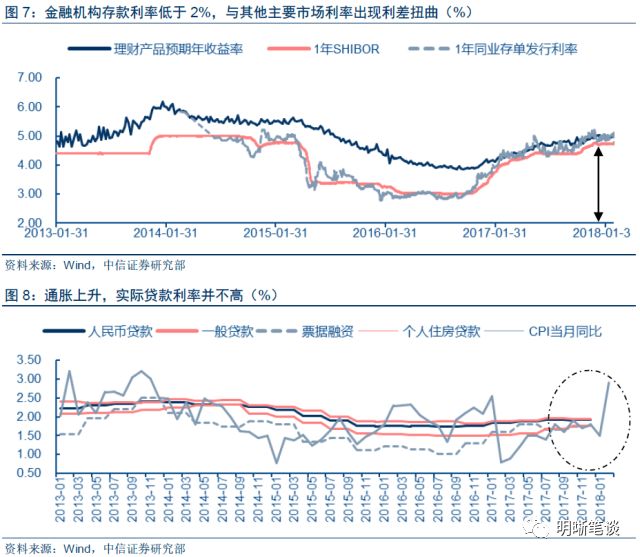 提高存贷款基准利率与利率市场化的推进和金融去杠杆的深化目标相一致。提高存贷款利率符合这一发展目标。其一,提高存贷款基准利率可以提高存款类金融机构控制负债端成本和资产端收益率的灵活性,有助于鼓励银行表外理财、通道业务等表外业务回归表内存款。其二,对于存款利率来说,低基准利率一定程度上束缚了银行表内存款利率,银行存款利率比较僵化,因此提高基准利率可以增加银行存款利率的弹性。同时,目前银行表内存款利率与存单利率、货币市场利率等主要类型市场利率相比偏低,上调存款基准利率有利于修正利差扭曲。其三,对于贷款利率来说,央行若上调贷款基准利率可能会出于控制宏观杠杆率的考虑,2017年银行贷款加权平均利率总体稳定略降,而且实际利率并不高,一定幅度内上调贷款贷款基准利率可能对实体经济的冲击有限。