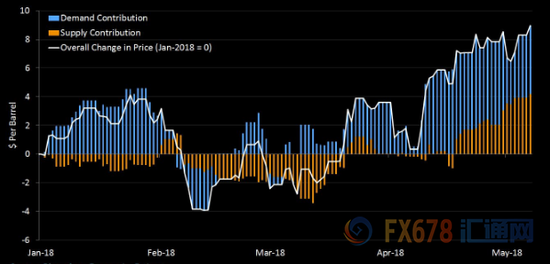今年油价已经上涨了14%,一半的涨幅都反应了市场强劲的需求。经济模型显示,其他推动油价上涨的关键因素是伊朗的紧张局势以及其他可能导致供给冲击的事件。美国退出伊朗核协议将严重阻碍伊朗的原油出口,但是这种供应冲击可能会伴随着其他地区产量的增加而减少。