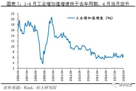 4月规模以上工业增加值同比7%,超出预期的6.4%,较前值提高1个百分点。工业生产超出预期主要有以下原因:一是春节较迟和两会时间长导致企业复工较晚的季节性因素消除,生产回归正常。二是出口增速从上月-2.7%明显上升到12.9%。三是汽车销售较好带动生产。