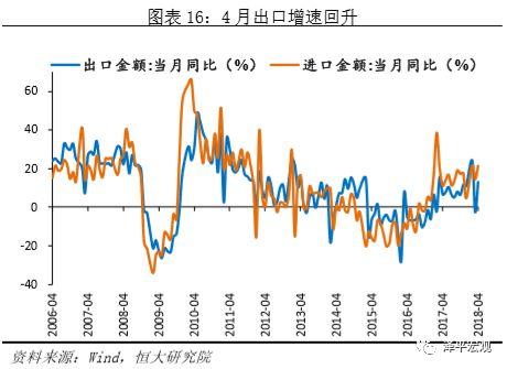 4月出口同比12.9%,较上月回升15.6个百分点。1-4月出口同比为13.7%,较去年全年上升5.8个百分点。当前外需仍整体向好,但4月美国、欧元区制造业PMI分别为57.3%、56.2%,较3月分别下降2、0.4个百分点。美国经济初现筑顶迹象,美国失业率降至2000年以来最低水平,通胀回升,加息加快,预示美国经济高位筑顶。