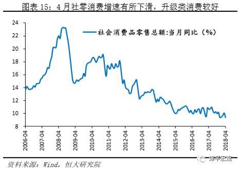 4月社会消费品零售总额同比名义增长9.4%,低于前值的10.1%。1-4月,社会消费品零售同比增长9.7%。消费升级势头明显,限额以上单位通讯器材类、化妆品类、建筑及装潢材料类商品零售同比分别增长10.8%、15.1%和11.4%。与地产相关的家电和家具增速有所下滑,分别为6.7%和8.1%。