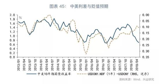 另一方面,虽然2018年以来中美利差出现收窄,但人民币升贬值预期较为均衡,表现为1年远期人民币汇率与即期汇率之差处于历史上较低的水平。
