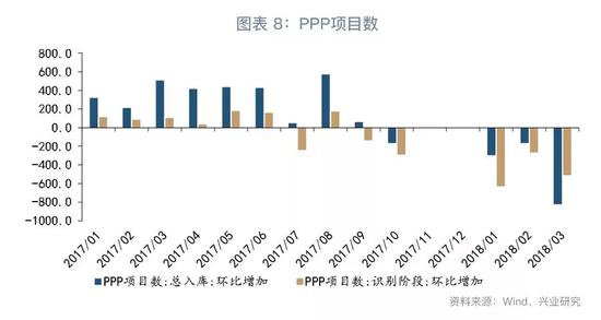 第二,PPP整顿的影响。2017年11月16日,财政部发布《关于规范政府和社会资本合作(PPP)综合信息平台项目库管理的通知》,此前快速增加的PPP项目数,无论是总入库数还是处于初始阶段的识别项目数,均开始持续减少。根据财政部统计,截至4月底被退库或整改的PPP项目数量和金额分别占总数的51%和36%。这无疑会对未来的基建投资产生冲击。