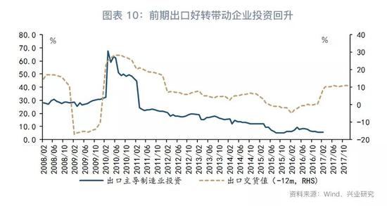 首先,从需求端看,前期外需好转带动出口导向制造业投资回升。数据显示,出口大致领先制造业投资一年左右,2016年下半年以来出口好转将有助于出口导向型行业投资增速的回升。