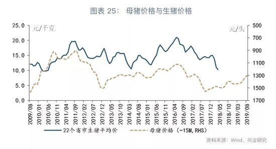 虽然生猪存栏数据的可靠性存疑,我们依然可以从利润和母猪价格两个角度间接观测生猪存栏的变化。一方面,养殖利润的提高能够激励养殖户补栏,因此生猪养殖利润对猪肉供给有一定的领先性。养殖利润与猪肉供给之间的关系显示,下半年生猪供给将有所下降。另一方面,扩大养殖规模会提高市场对母猪的需求,引起母猪价格抬升,因此母猪价格也可以作为猪肉价格的领先指标。从母猪价格来看,下半年猪肉价格有上升的动力。
