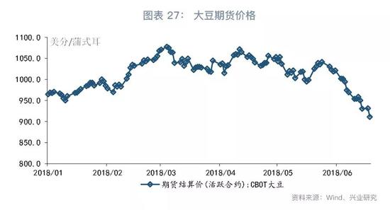 我们在2018年4月发布的报告《贸易战阴云下的大豆及其对国内物价的可能影响》指出:如果国内大豆价格上涨25%,对CPI同比的影响约0.4个百分点;如果国内大豆价格上升10%,对CPI同比的影响在0.1至0.2个百分点之间。值得注意的是,对美国大豆征收25%的关税并不会引起国内大豆价格等比例的上涨。一方面,受中美贸易冲突的影响,美国大豆价格出现了大幅的下跌。截止6月19日,CBOT大豆价格已经累计较2018年初下跌5.6%。