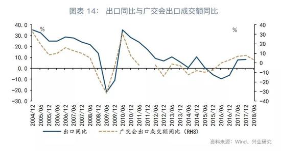 进一步观察中国出口晴雨表,中国广交会作为外贸经济的晴雨表,其出口成交额对未来半年出口走势具有一定的前瞻性。于5月结束的广交会出口成交额为300.8亿美元,同比增长3.1%,增速较前期下降5个百分点。