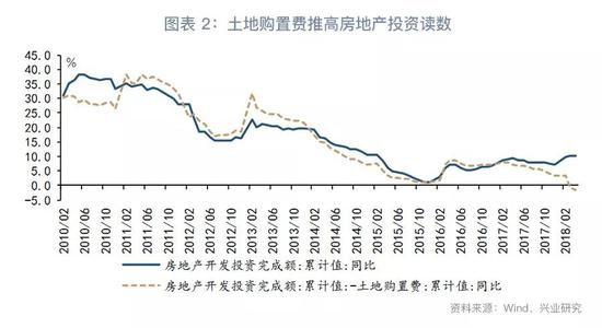 2018年前5个月房地产开发投资同比增长10.2%,高于去年全年的7.0%和去年同期的8.8%。从细分来看,房地产投资加快主要是得益于土地购置费[1]。若剔除土地购置费,则房地产投资增速自2017年初以来是持续回落的,今年前4个月同比增速为-1.6%。