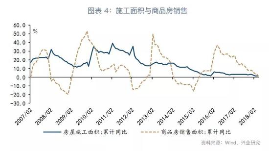 展望未来,历史上房地产周期一般为3年,若纯粹从历史的机械重复看,则以上一轮周期低点2015年2月推断,这一轮房地产周期低点应为2018年2月,但从目前的态势来看,2月实际上并非低点。房地产周期既已失效,则需要寻找有助于判断未来周期走势的新线索。我们发现,短期国债利率的同比变动是商品房销售较好的领先指标,背后逻辑可能是,短期国债利率对货币政策变动较为敏感,其变动反应了货币政策动向,而货币政策的影响会逐渐传导至房地产市场。若按这种领先关系推断,商品房销售可能要到今年第三季度末、第四季度初才能到达本轮周期底部。进一步考虑到施工面积在一定程度上滞后于商品房销售,则可以预计今年年内施工面积增速会继续低迷。