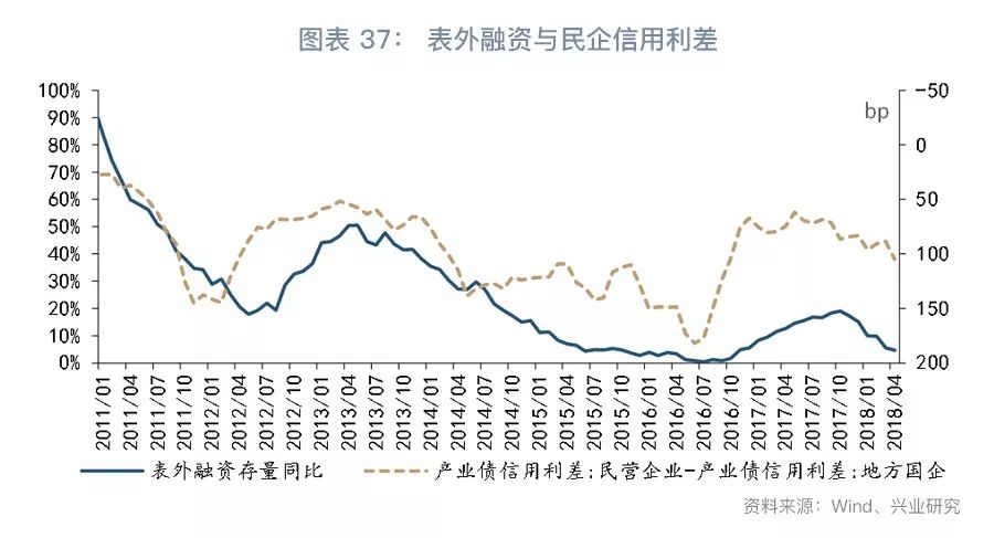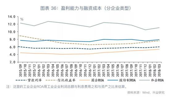 第二个挑战是非国有企业利润增长放缓与融资成本上升之间的冲突。2018年第一季度股份制企业ROA与私营企业ROA分别为7.9%和11.1%,较2017年同期的8.0%和12.4%有所下降,但表外融资呈现出“量降价升”的局面。从量的角度看,表外融资增长的放缓往往伴随着民营企业信用利差较地方国企走阔。从价的角度看,融资成本的上升压缩了企业的盈利空间。展望下半年,工业企业利润增速可能随PPI同比而放缓,而表外融资渠道仍然处于收缩调整期,我们需要警惕融资成本超过名义增长,阻碍当前的“漂亮去杠杆”进而带来通缩压力。