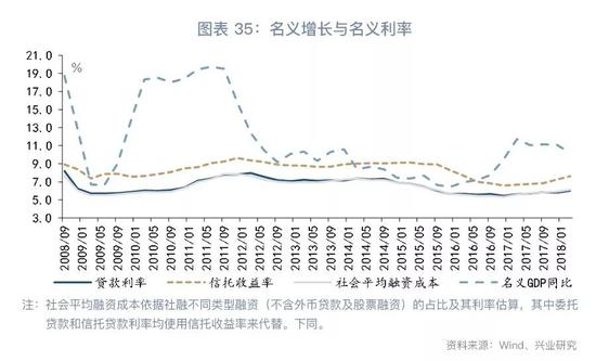 在宏观杠杆率增长放缓的同时,我国的名义GDP增速开始超过信托收益率。尽管2009年以来我国的名义GDP增速始终高于贷款利率,考虑到我国融资体系中存在的各种数量限制,边际企业的融资成本应该比贷款或各类企业债利率更能代表融资的真实成本与压力,从数据可获得角度的,这些所谓边际企业的融资成本,就是以信托为代表的表外融资成本,其是部分高杠杆主体(如地方融资平台、房地产企业)和一些获取贷款难度较大的中小企业的重要融资渠道。2017年我国的名义GDP增速为11.2%,显著高于同期6.9%的信托收益率。因此,在控制宏观杠杆率的环境下,2017年以来经济表现依然亮眼。