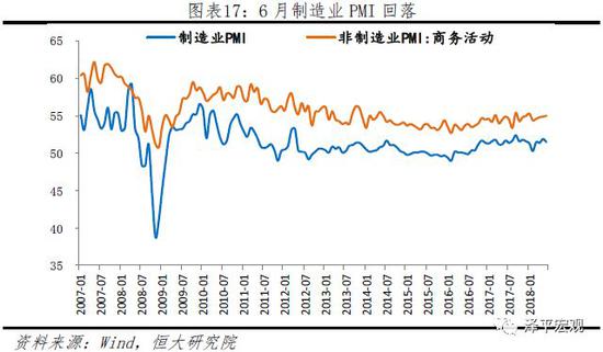 上半年制造业PMI均在50%以上的景气区间运行,但新出口订单、生产经营活动预期指数回落,后续经济存在回落压力。第一,制造业整体、生产和需求总体稳步增长。6月制造业PMI为51.5%,比上月略回落0.4个百分点,仍高于上半年均值0.2个百分点,制造业总体保持扩张。生产和新订单指数处于扩张区间。第二,高端制造总体较好。专用设备制造业、计算机通信电子设备及仪器仪表制造业PMI高于整体PMI。第三,从企业规模看,大企业依然好于中小企业,行业集中度提高。6月大型企业PMI为52.9%,比上月回落0.2个百分点,仍为年内次高点,是制造业保持稳步扩张的主要支撑;中型企业PMI为49.9%,比上月下降1.1个百分点;小型企业PMI为49.8%,比上月回升0.2个百分点。第四,新出口订单指数、生产经营活动预期指数回落,预示经济后续承压。新出口订单指数为49.8%,比上月下降1.4个百分点,后续受中美贸易战影响,预计出口下滑。