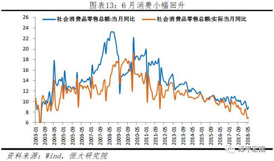 上半年社会消费品零售总额同比名义增长9.4%,低于一季度的9.8%、去年同期的10.4%和去年全年的10.2%。其中,6月社会消费品零售总额同比名义增长、实际增长9%、7%,较5月上升0.5、0.2个百分点。分类别看,餐饮收入和商品零售消费同比分别增长10.1%、8.9%,较上月上升1.3、0.5个百分点。在限额以上单位商品零售中,受“618”购物节促销、端午节假期错位、世界杯等影响,除文化办公用品类、汽车类同比下滑外,其他商品同比均有不同程度上升。6月文化办公用品类、汽车类同比3.5%、-7%,分别较上月下滑4.5、6.5个百分点。地产相关的家用电器和音像器材类、家具类消费、建筑及装潢材料类同比分别为14.3%、15%、7.2%,分别较上月加快6.7、6.4、0.4个百分点。