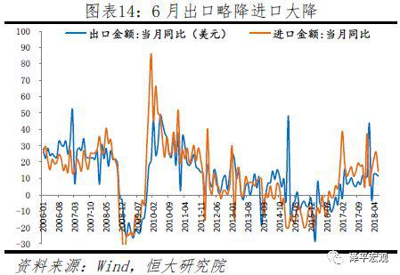 随着未来美国经济高位筑顶,欧元区经济边际下行,同时美国可能对2000亿美元进口中国商品的加征关税情况,中国出口将可能受到抑制;在进口方面,由于7月国内部分关税调整,部分商品将恢复进口。下半年经济将更加依赖内需。