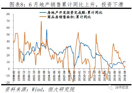 地产投资延续高位缓降,后期因融资压力、棚改货币化收紧、销售下行等仍将进一步下行。上半年地产投资同比9.7%,低于一季度的10.4%,但高于去年同期的8.5%和去年全年的7%。其中,6月地产投资同比8.3%,较5月下降1.7个百分点,自3月高点10.9%后连续三个月下滑。剔除价格后,二季度地产投资实际累计同比3.8%,低于一季度的3.9%,但高于去年同期的3.7%,去年全年的1.1%。今年上半年地产投资超预期的主要原因在于:一是严监管、紧信用背景下,房企通过“高周转”加快投资回笼资金,1-6月新开工面积同比上行1个百分点至11.8%,高于去年同期的10.6%和去年全年的7%;二是三四线城市棚改货币化安置驱动,2018年棚改目标580万套,1-6月完成363万套、占62.5%,新增PSL合计同比增长38.8%。三是去年下半年补库存、前期土地购置费分期延后计入。6月商品房库存继续去化,但累计同比跌幅收窄至-14.7%,土地购置面积累计同比较1-5月上行5.1个百分点至7.2%。未来房地产调控的重点是防止三四线城市地产库存反弹,和一二线房价反弹。