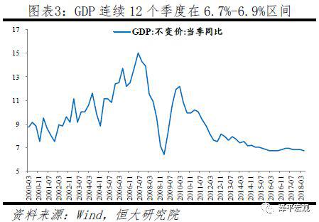 2018年二季度GDP实际同比6.7%,较一季度的6.8%稍有下滑,连续12个季度保持在6.7%-6.9%的区间,表明经济L型韧性强。从生产侧看,二季度一产增加值同比3.2%,与一季度持平;二产增加值同比6%,较一季度下滑0.3个百分点;三产增加值同比7.8%,上升0.3个百分点。