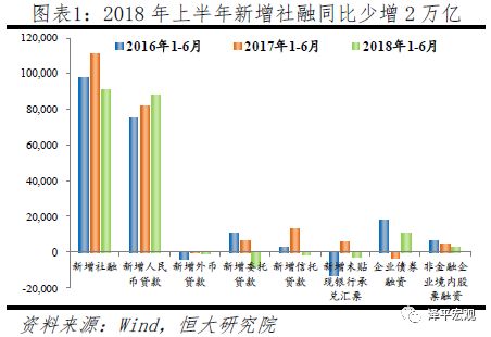 2018年上半年社融新增9.1万亿,较2017年同期少增2万亿元,6月社融增速9.8%,M2增速降至8%,两项数据均创历史新低。融资条件持续紧缩及债务到期双重压力下,近期信用债违约频率快速上升,截止7月13日违约金额同比增48%,我们维持“金融周期顶部”判断,最困难的时候可能还未到来。6月社融口径新增信贷1.67万亿元,连续两月超过新增社融,成为支撑社融主因。信托贷款、委托贷款、未贴现票据等表外非标通道业务进一步收缩。近期市场流动性稳健提振债券融资,股票融资持续低迷。