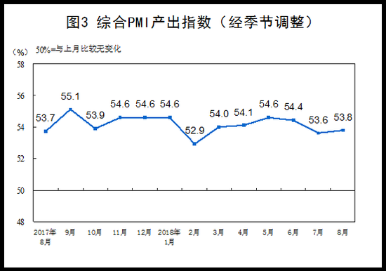 2018年8月份,综合PMI产出指数为53.8%,高于上月0.2个百分点,表明我国企业生产经营活动总体扩张步伐有所加快。