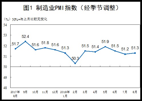 2018年8月份,中国制造业采购经理指数(PMI)为51.3%,比上月上升0.1个百分点,制造业总体保持平稳扩张态势。