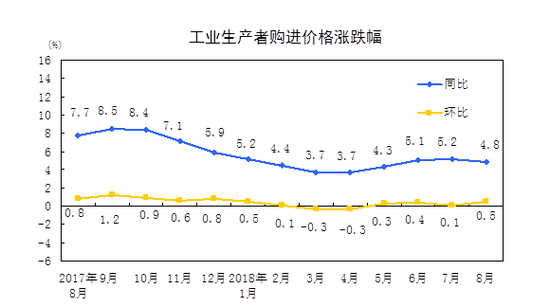 2018年8月份,全国工业生产者出厂价格同比上涨4.1%,环比上涨0.4%。工业生产者购进价格同比上涨4.8%,环比上涨0.5%。1-8月平均,工业生产者出厂价格比去年同期上涨4.0%,工业生产者购进价格上涨4.5%。