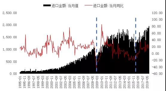 回顾历史,中国进口形势大致可以分为三个阶段,第一个阶段是在2008年之前,增速保持窄幅波动,进口金额持续攀升;第二个阶段,则是增速不断回落的过程,这与经济增速回落存在比较明显的一致性关系;第三个阶段,则是从2016年开始,增速的再次回升。