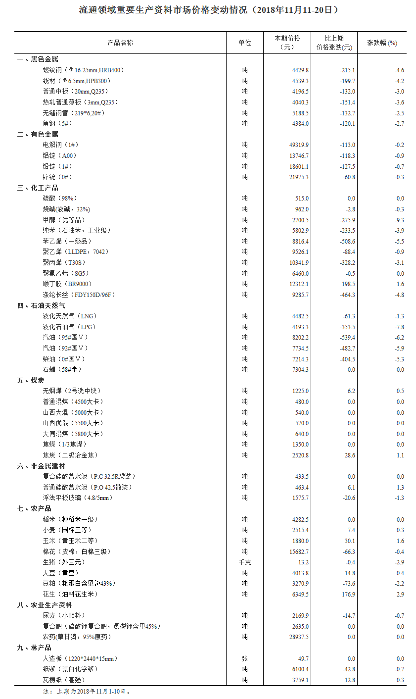 据国家统计局11月26日消息,国家统计局发布流通领域重要生产资料市场价格变动情况(2018年11月11-20日)。
