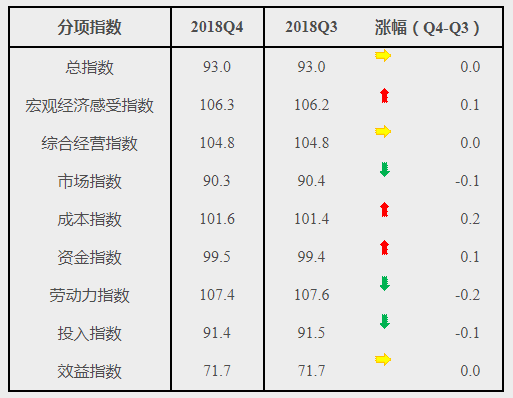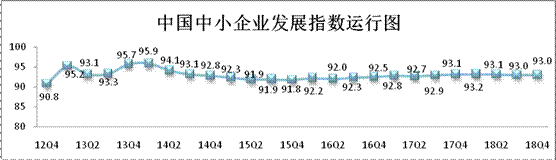 2018年四季度中国中小企业发展指数(SMEDI)为93.0,与上季度基本持平,继续低位运行。分行业指数5升3降,分项指数3升2平3降,下降的面比上季度有所收窄。2018年11月1日,习近平总书记召开民营企业座谈会,给民营企业吃了“定心丸”。一系列利好政策的出台,提振了民营企业发展的信心,但考虑到政策落地尚需时日,且2019年国内外发展形势更加复杂严峻,不稳定不确定因素增多,经济下行压力加大,因此,中小企业发展状况的改善还需要一个过程。