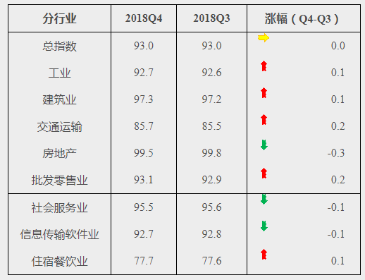 分行业指数5升3降。分行业指数的情况如下表所示。八个分行业指数均位于景气临界值100以下。其中,工业、建筑业、交通运输、批发零售业、住宿餐饮业5个行业指数较上季度有所上升,房地产、社会服务业、信息传输软件业下降。本季度行业指数下降的面较上季度有所收窄,但下降指数的降幅有所扩大。