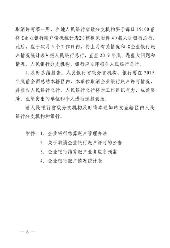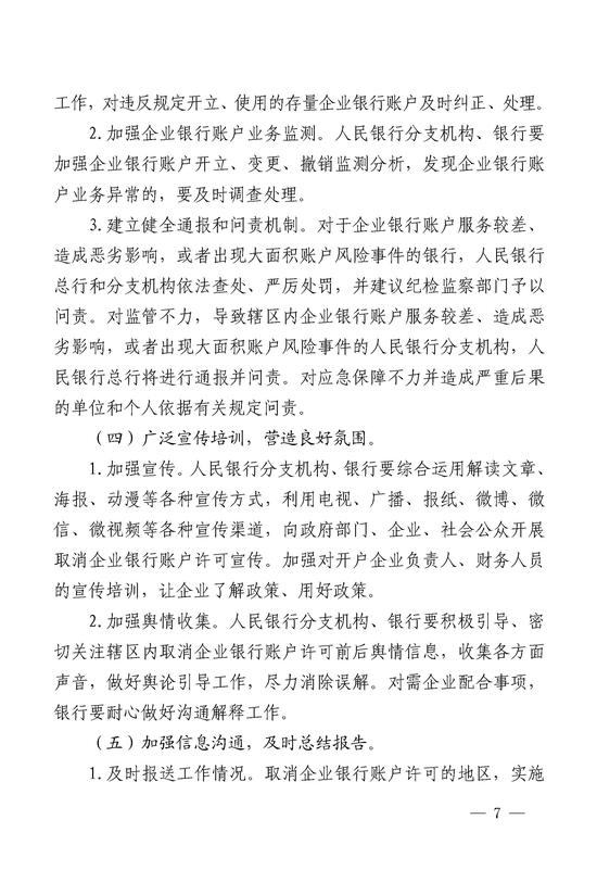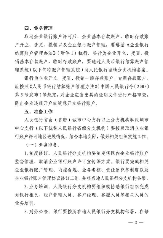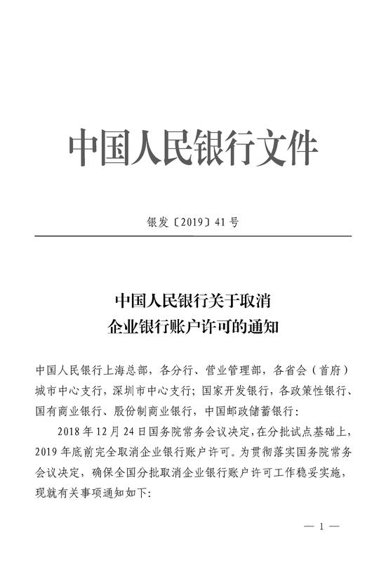 央行发布通知,自2019年2月25日起,取消企业银行账户许可地区范围由江苏省泰州市、浙江省台州市扩大至江苏省、浙江省;其他各省(区、市)、深圳市在2019年年底前完成取消企业银行账户许可工作。