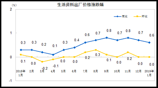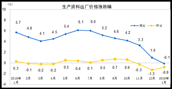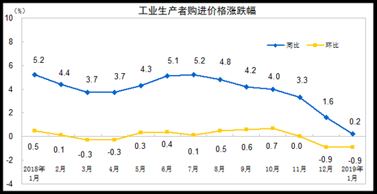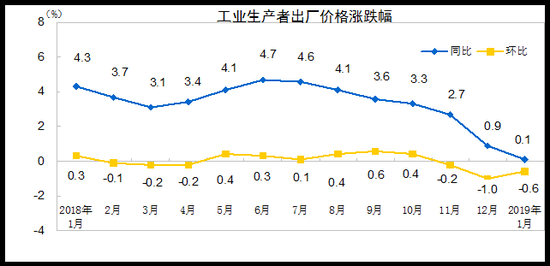 2019年1月份,全国工业生产者出厂价格同比上涨0.1%,环比下降0.6%;工业生产者购进价格同比上涨0.2%,环比下降0.9%。