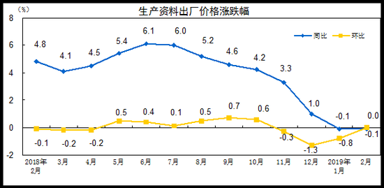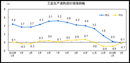 2019年2月份,全国工业生产者出厂价格同比上涨0.1%,环比下降0.1%;工业生产者购进价格同比和环比均下降0.1%。1—2月平均,工业生产者出厂价格和购进价格均比去年同期上涨0.1%。