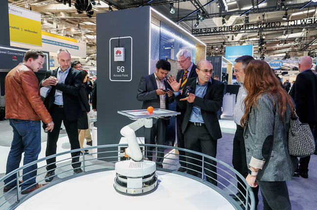 制造业强,企业必须强。图为2018年4月24日,在德国汉诺威工业博览会上,参观者在华为公司展区观看运用第五代移动通信技术(5G)操控的机器人(19.800, 0.05, 0.25%)。该机器人利用5G技术的协助保证操控的稳定和精确,使方形盘子上的小球不会滚落。 新华社记者 单宇琦/摄