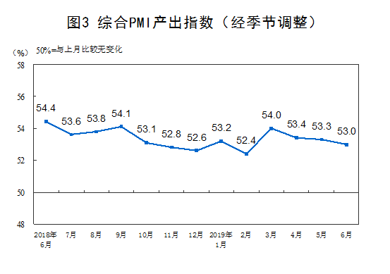 2019年6月份,综合PMI产出指数为53.0%,比上月回落0.3个百分点,表明我国企业生产经营活动保持扩张,但步伐有所放缓。