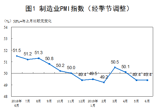 2019年6月份,中国制造业采购经理指数(PMI)为49.4%,与上月持平。