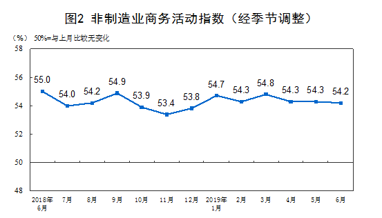 2019年6月份,中国非制造业商务活动指数为54.2%,比上月微落0.1个百分点,继续位于扩张区间。